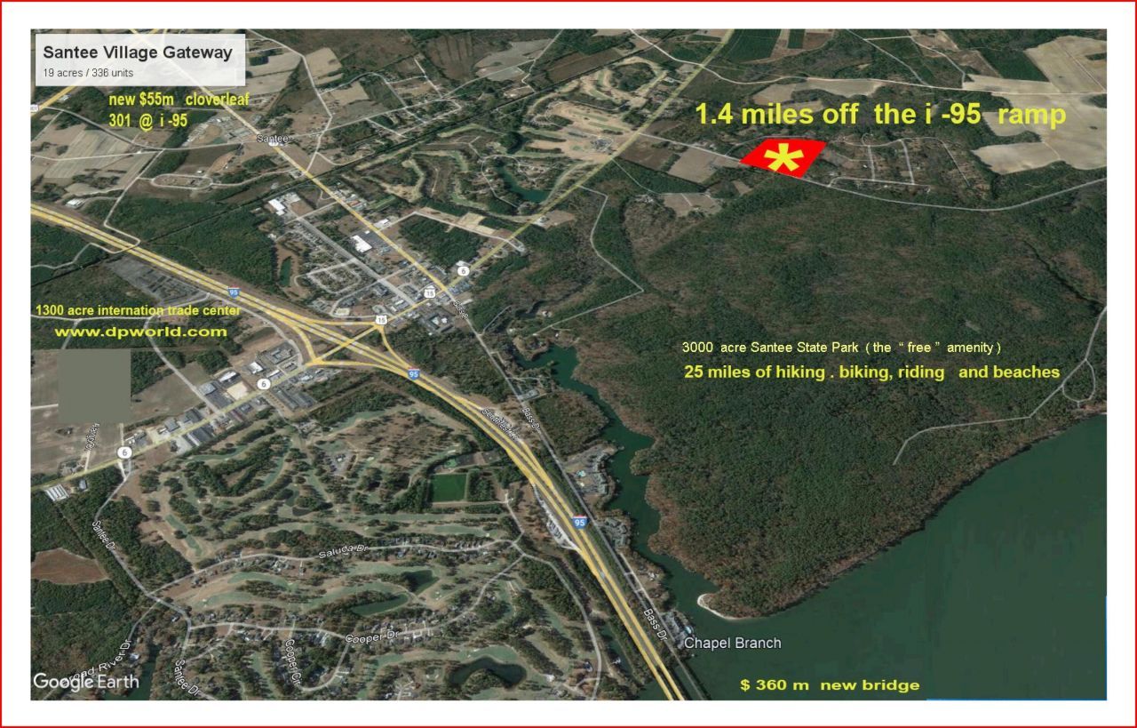 Vacant land, +/- 19 acres high acres for RV Park with +/- 4 acres for commercial use. See PUD documents. PUD allow 160 RV Pads. Sewer vault 300' from edge of parcel. Sewer capacity will be available Q2 2027. Santee State Park (+/- 3,000 acres) at the end of road. Shopping, golf courses, and I-95 very near property.