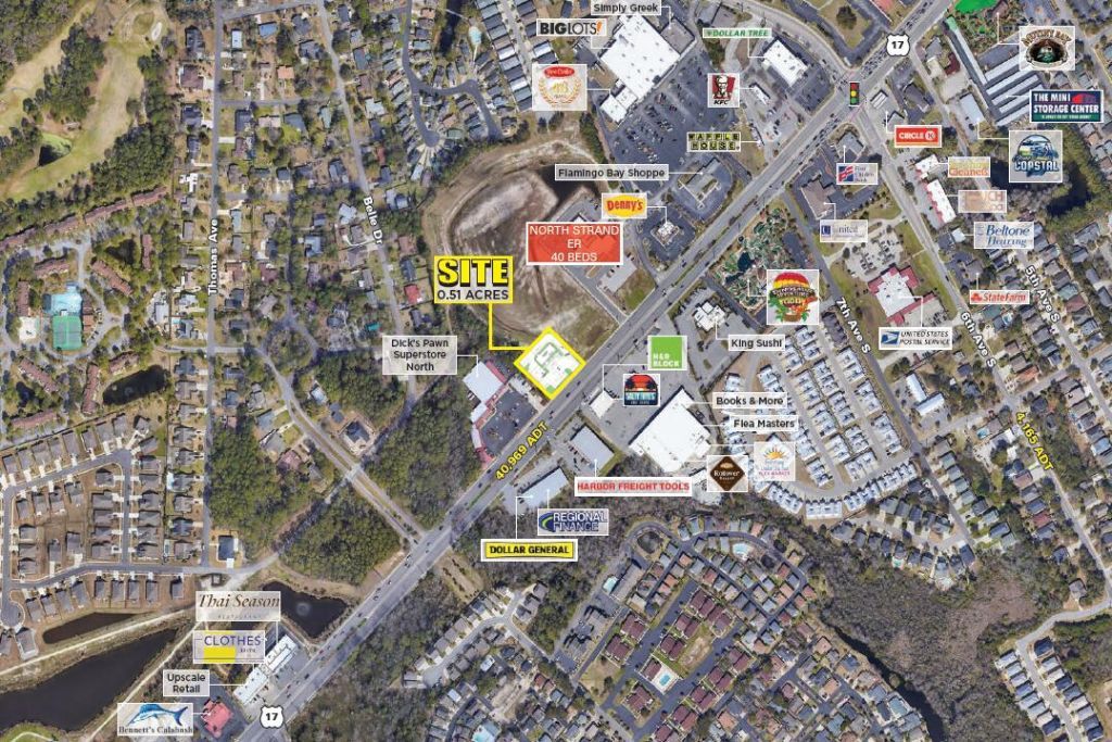 Prime Hwy 17 N frontage with 40,969 ADT andexceptional visibility +/-0.51 AC pad ideal for a +/-2,000 SF restaurant Surrounded by established retail & dining alongKings Highway Strong area demand drivers, including NorthStrand ER and nearby neighborhoods Located in the Myrtle Beach MSA (HorryCounty) serving local and tourist traffic