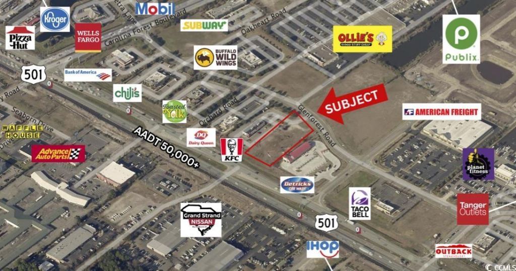 Approximately 1.17 Acre Development Ready Outparcel to the Carolina Forest Square Shopping Center. The site has direct frontage onto U.S. Highway 501, and is easily accessed from Highway 501 via a deceleration lane and right in-right out onto Orchard Drive. Neighboring retailers include: Publix, Ollies, KFC, Dairy Queen, the Tanger Outlets, Kroger, and Publix. Carolina Forest is one of the fastest growing Communities in the state. This Site boasts one of the highest traffic counts in the Market with ADT greater than 50,000 and is in close proximity to Highway 31.
