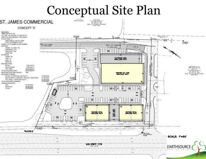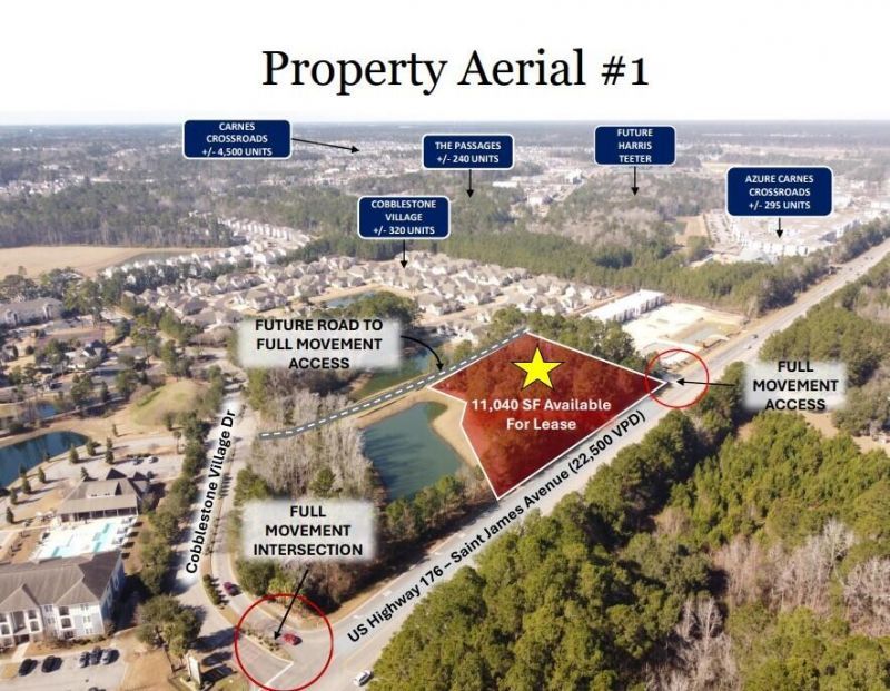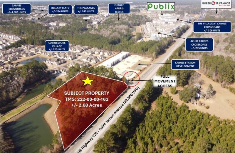 The subject property is located along U.S. Highway 176 (Saint James Avenue) in Goose Creek, South Carolina, within Berkeley County (TMS #222-00-00-163). The +/-2.60-acre parcel offers significant frontage on U.S. Highway 176 and is planned for development as a three-building commercial project.The rear building will be developed as a daycare facility, while the front building is well suited for retail, service, and restaurant tenants seeking excellent visibility and prominent signage along a major corridor.The property will be served by a direct, full-movement access point on U.S. Highway 176, shared with the adjacent Carnes Station retail development. In addition, a future roadway at the rear of the site will provide secondary access via the existing full-movement intersection at Cobblestone Village Drive.The proposed development will include an approximately 12,000-square-foot daycare facility in the rear of the site and two approximately 5,520-square-foot multi-tenant retail buildings at the front for a total of 11,040 SF. The retail buildings will each have a courtyard endcap. The development will be served by a shared parking lot providing a total of 108 parking spaces.Tenant Improvement Allowance is available and dependant of Tenant Creditworthiness, Lease Term, etc. -- Please contact broker for more details.