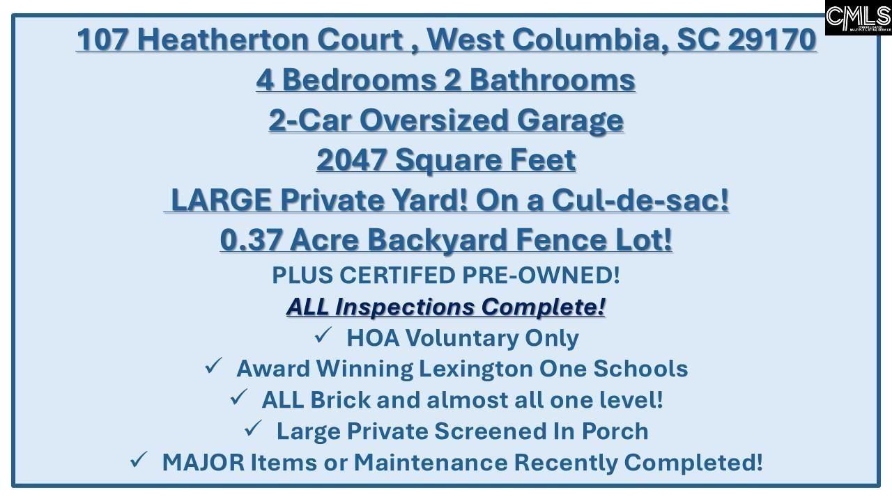 OPEN HOUSE SUN 3/8 1-4PM MUST SEE IN PERSON to truly appreciate this ALL BRICK, solid-built ranch home at 107 Heatherton Court! Built in 1989 and lovingly maintained by its ONE family and ONLY family owner, this home reflects true pride of ownership throughout. Inspection documents are available for full transparency and peace of mind. Three of the four bedrooms - including the recently renovated Primary Ensuite (January 2026) - are conveniently located on the main floor. The fourth bedroom serves perfectly as a bonus room and offers rare walk-in attic storage you simply don't find in many newer homes.Situated on a LARGE cul-de-sac lot backing to greenspace, this nearly .4-acre property offers privacy with a full fence and an expansive backyard ideal for entertaining, pets, or play. Enjoy relaxing mornings or evenings on the spacious screened-in porch overlooking the massive yard.The kitchen features all-wood cabinetry, granite countertops, newer appliances, and a bright eat-in bump-out area with views of the backyard. The Great Room showcases vaulted ceilings and a cozy gas log fireplace, while the Formal Dining Room highlights original hardwood floors, adding warmth and character.Major updates include a new roof (September 2025), new windows (December 2024), new garage door (January 2025), new vapor barrier (October 2025), a tankless water heater (January 2023), and a mini split system in the bonus room (August 2019). This is a rare opportunity to own a well-built, meticulously maintained, one-owner brick ranch in a private cul-de-sac setting - a home that truly stands the test of time. See the walkthrough video https://youtu.be/Jx6LhDdbC8c?si=rOiktwyaVL4ll-ti One of the sellers is a licensed agent. Disclaimer: CMLS has not reviewed and, therefore, does not endorse vendors who may appear in listings.