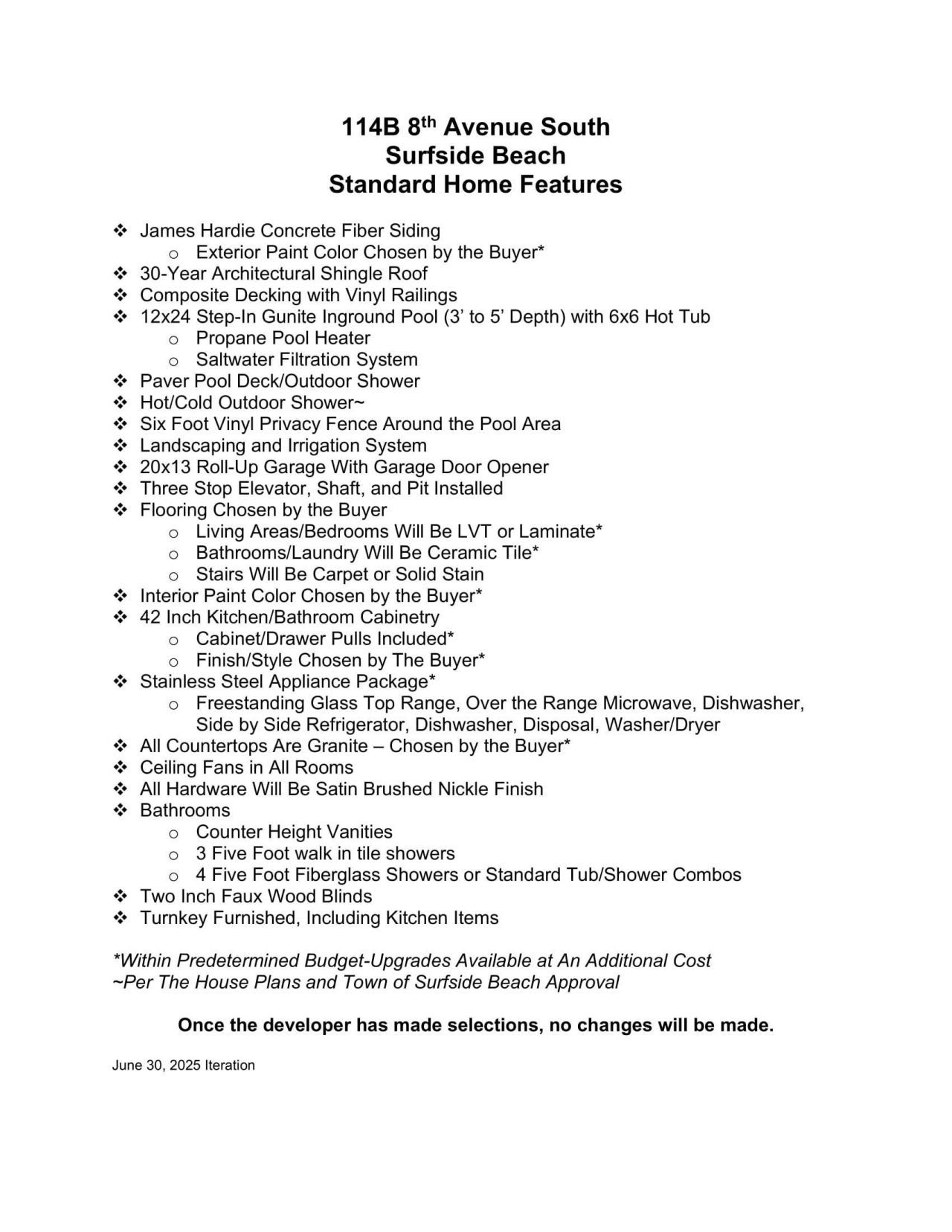114B 8th Ave S Walkin On Sunshine, Surfside Beach, is a single-family raised beach home currently under construction with an expected early 2026 delivery. It offers 3,349 heated square feet with 7 bedrooms and 7.5 bathrooms, making it ideal for large families or as a high-performing vacation rental investment. Designed for longevity and low maintenance, the home will feature James Hardie concrete fiber siding, a 30-year architectural shingle roof, and composite decking with vinyl railings. Buyers can select finishes or make upgrades during construction, adding a personalized touch to their future home. The backyard oasis includes a 22x13 gunite pool, a hot tub, and a paver pool deck, all equipped with a propane heater and a saltwater filtration system for year-round enjoyment. Beautiful landscaping and an irrigation system enhance the propertys curb appeal. A unique highlight is the 20x13 garage with a roll-up door and automatic opener. Inside, luxury vinyl and tile flooring pair seamlessly with custom cabinetry and granite countertops in the kitchen and bathrooms. The stainless-steel appliance package includes a glass-top range, microwave, dishwasher, refrigerator, disposal, and washer/dryer. A three-stop elevator ensures convenient access across all floors. Additional interior features include ceiling fans in every room, brushed nickel hardware and fixtures, and counter-height bathroom vanities. The property is being sold fully furnished, including kitchen essentials, making it truly turnkey and rental-ready. Zoning allows for short-term vacation rentals. Located just a short walk or golf cart ride to Surfside Pier, the entertainment district, grocery stores, restaurants, parks, tennis and bocce courts, a baseball diamond, the library, and the seasonal farmers market, this home offers unbeatable access to all Surfside Beach has to offer. Myrtle Beach is just a 20-minute drive away. Explore the Matterport 3D Virtual Tour www.bit.ly/7BRVirtualTour for a detailed look at what the finished home may look like. Images and the virtual tour represent the potential completed appearance. If youre searching for a luxurious, spacious beach house with ocean views and convenient access to amenities, 114B 8th Ave S deserves your attention.