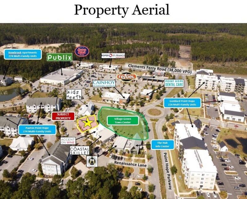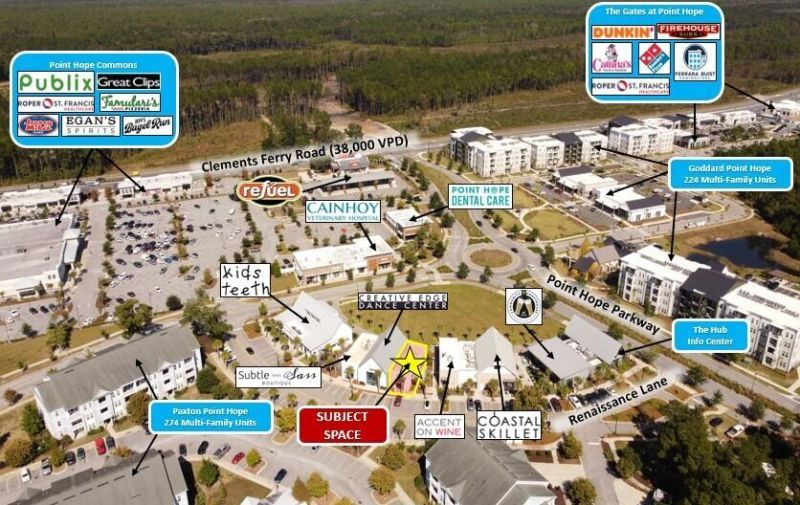 Located in the Point Hope Master Planned Community, the +/- 1,391 SF Subject Restaurant Space sits on the Village Green Town Center which has excellent visibility, signage opportunities, and is in close proximity to Publix, multi-family developments and other shops.The Subject Space is part of a larger 5,000 SF building that has two existing Tenants - Creative Edge Dance Studio and Subtle & Sass Boutique.The Subject Space is currently built out as a restaurant and has an existing grease trap and is available immediately.Please contact Broker for more details.