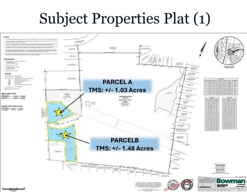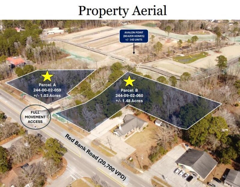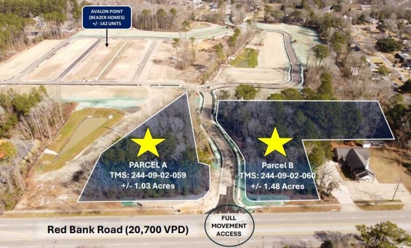 The Subject Properties are vacant land located along Red Bank Road, in Goose Creek, SC. The parcels are zoned General Commercial and can be identified as Berkeley County TMS#244-09-02-059 consisting of of +/- 1.03 Acres and TMS#244-09-02-060 consisting of +/- 1.48 Acres for +/- 2.51 Total Acres.The property will serve as the entrance to the Avalon Point Residential Development that is under construction and will have a mix of 142 Single-Family and Townhome units.The commercial acreage fronting Red Bank Road is listed for sale at $400,000/ acre