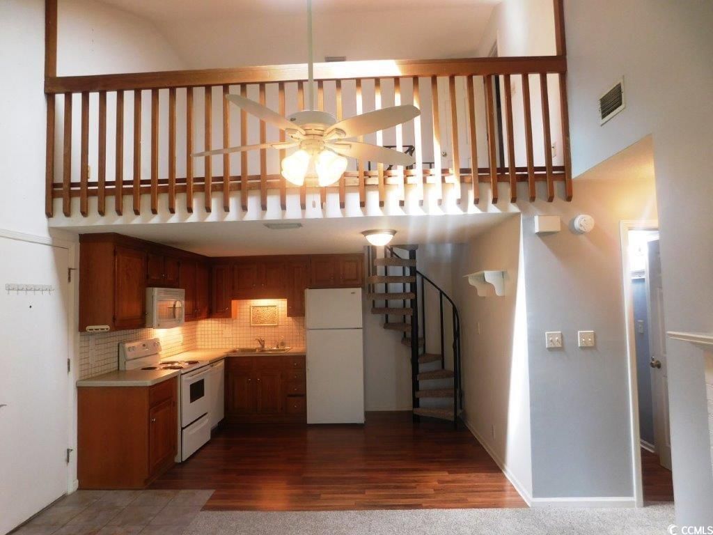 Adorable 2 BR/ Loft/ 2 bath condo in the heart of Myrtle Beach located in desirable Sterling Village III. Walk into this open, airy floor plan and be impressed with the soaring cathedral ceilings, fireplace, brand new carpet, skylight, and a full wall of windows that provide a bright, light, warm welcoming feeling. Living Room windows have a window seat that stretches full length of windows providing a great extra built-in sitting area. Living room is open to the kitchen with a phenomenal back splash, plus a pantry, range, microwave, dishwasher, and refrigerator. The master bedroom is on main level and is expansive, featuring huge double master closet to be envied by all, plus sliders leading to your own private balcony to enjoy grabbing some sun rays ,reading, morning coffee or cool afternoon drinks. Master has a door to a full bath complete with tub/shower and for your convenience an area with a front end load washer and dryer, which convey. The bath has wood laminate flooring and granite topped sink and is located perfectly with door to hall for convenience for you and guests. Theres a second level with an awesome loft providing an additional sleeping area and yes it too has a full bath. See this unit , youll be impressed with new carpet in the bedroom, family room and stairs and the layout of unit is spectacular . Whether youre looking for a primary, secondary home, or investment property youll be pleased and want to call this one yours- plus dont forget the ocean, restaurants, golf, entertainment, shopping, and all Myrtle Beach has to offer is only minutes away.