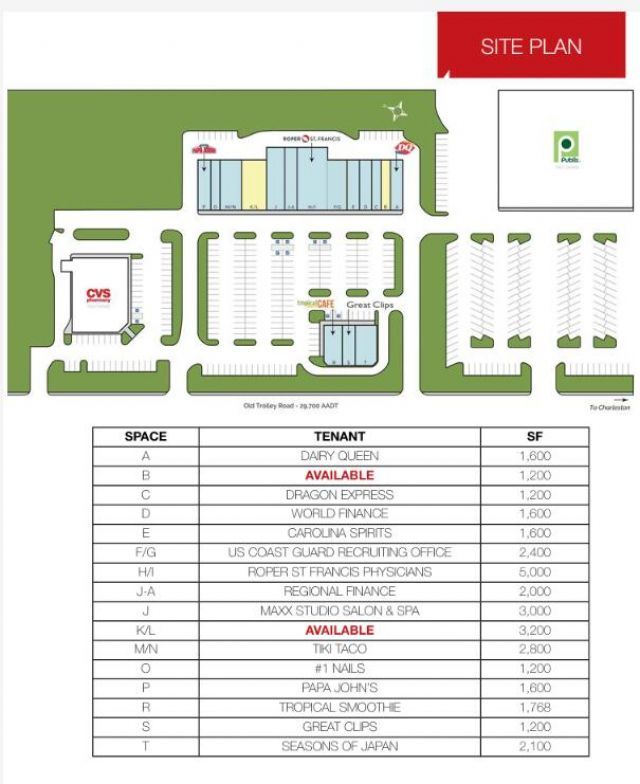Trolley Square is located on Old Trolley Road, a major thoroughfare just minutes from downtown Summerville, one of Charleston's fastest growing suburban communities. There are four units available, ranging from +/-1,200 to +/-3,200 SF. The center is next door to Publix and CVS with exceptional cross access between the properties. 171 surface parking spaces included & a dedicated turn lane. 28,000 VPD on Old Trolley Road. Current national tenants include: Great Clips, Roper St. Francis, Papa Johns & Dairy Queen