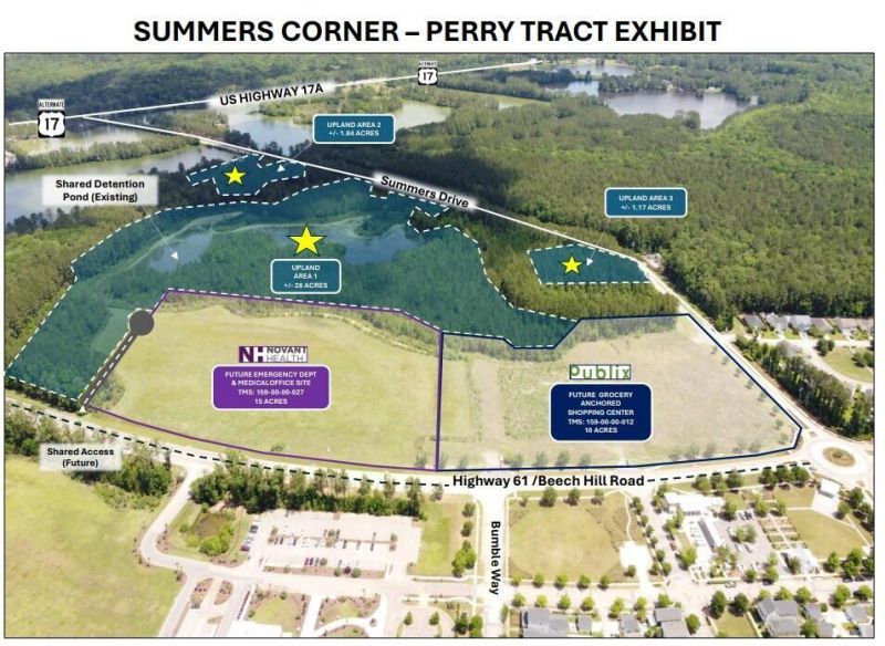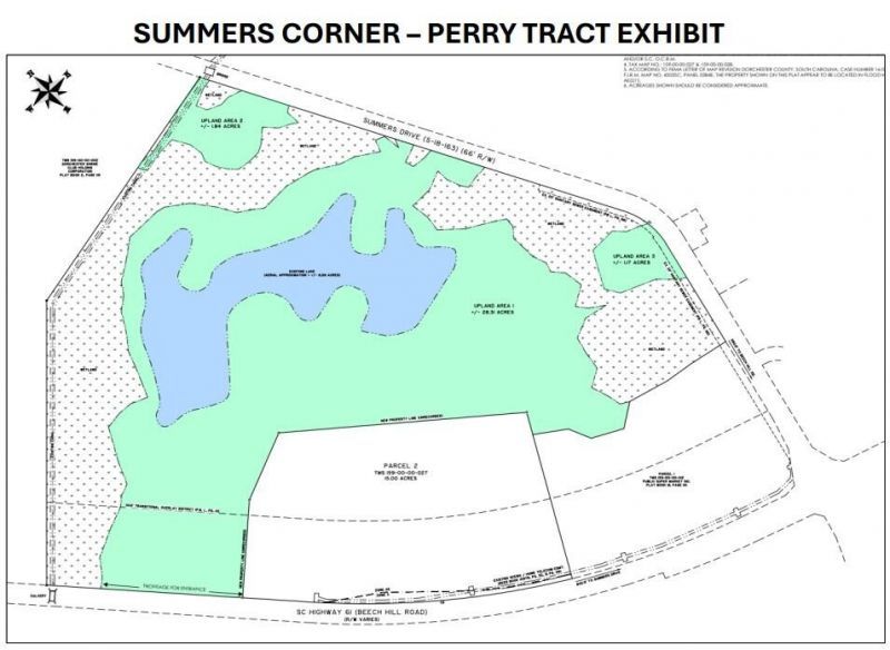 Summers Corner is a 6,900-acre master planned community in Dorchester County. The development boasts an allowable density of 7,400 single family units, to include an age restricted community of over 1,000 additional units, and 200+ acres of commercial land.The subject property, referred to as the ''Perry Tract'' consists of 56 acres, highly prominent and located at the entrance to the community with substantial frontage on Hwy 61 near its intersection with Summers Drive. The best utility of the property is to be subdivided into smaller parcels. The graphics shown within this listing are conceptual only but show how the property can be divided into separate uses [such as multi-family, medical office, retail].