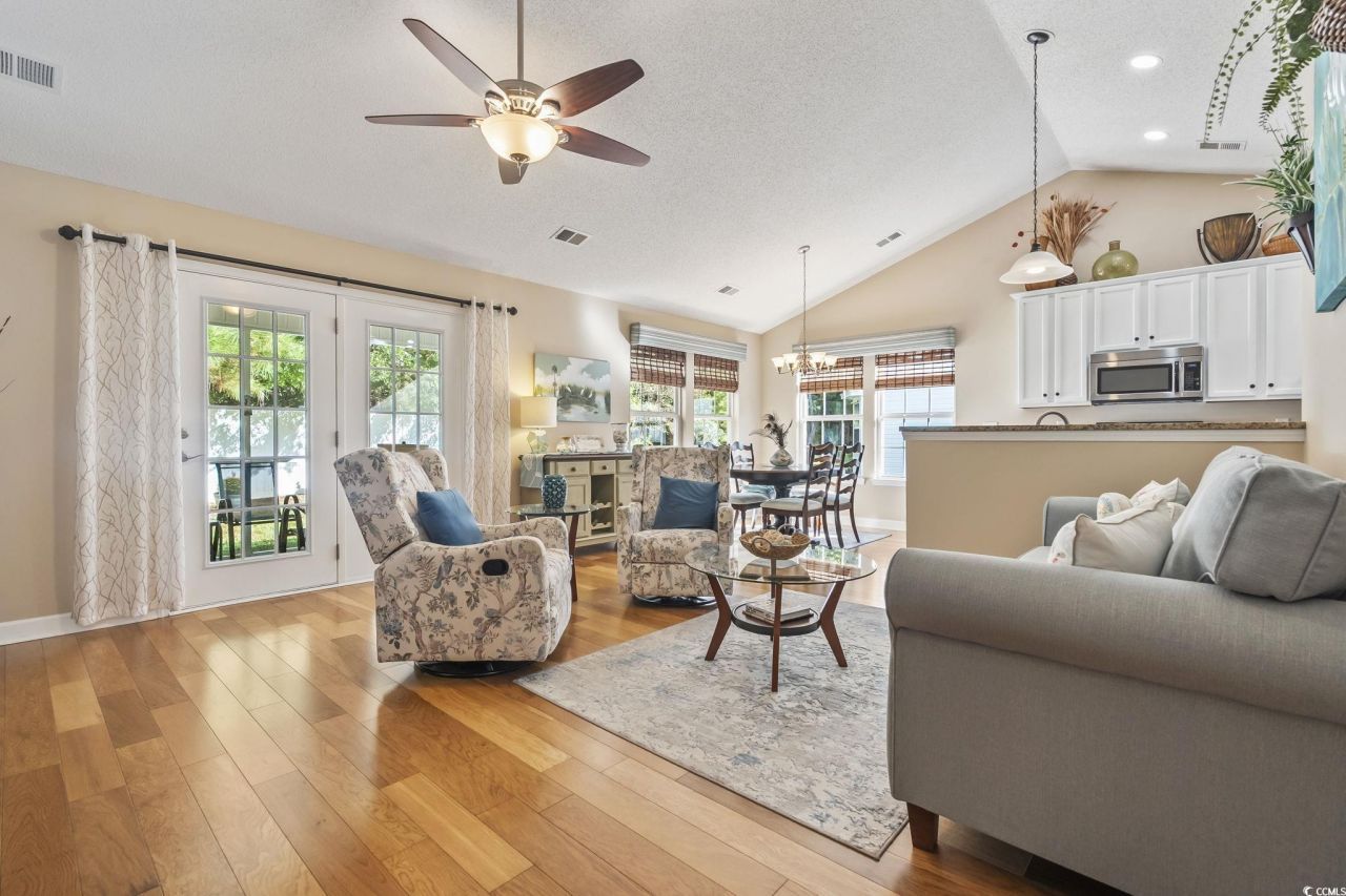 This 2-bedroom, 2-bath home nestled in a desirable and friendly community of Carolina Crossing. Step inside to a foyer to welcome guest and this spacious open floorplan that includes vaulted ceilings that create an airy feel. The primary bedroom feature a walk-in closet, private bathroom with double sinks, stand alone shower, and a tub. The second bedroom has a walk-in closet, and the hall bathroom, with a shower/tub combo, connects to this room also; making it perfect for visitors or family. The kitchen has ample cabinets, pantry, granite countertops and stainless steel appliances. A separate dining area creates a great space for entertaining. The large separate laundry room has storage space and including the washer and dryer. The 2 car garage has a separate door for your convenience. Outside, the property includes an irrigation system and hurricane shutters for peace of mind. The newer roof was installed in 2024. The screened in patio includes an additional patio for sunning or grilling. HOA dues cover lawn mowing, trash pickup, basic internet, pool and irrigation water. This home is a short drive to the Little River waterfront, shopping, restaurants and the beaches of North Myrtle Beach. A wonderful combination of comfort and convenience; this home is move-in ready and waiting for you.