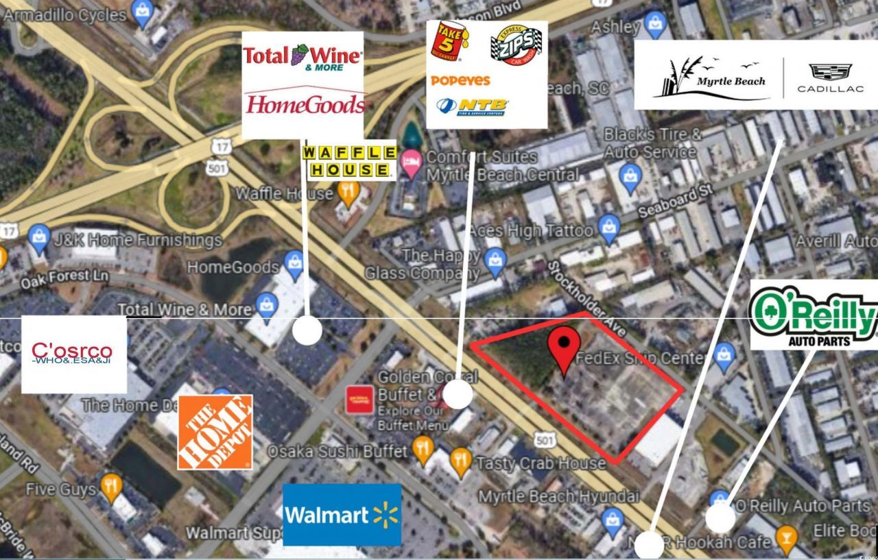 This listing consists of lot #3 but there are two lots total on Highway 501. The lots at Madison Green have frontage on Highway 501 and are just minutes away to Wal-Mart, 1/4 mile away from Highway 17 Bypass, 1/2 mile away from Robert Grissom Parkway and just 1 mile from the beach. Both lots have access to two existing driveways onto Highway 501 as well as a shared roadway going to Stockholder Avenue. This part of Highway 501 sees about 30,000 cars per day on average (more than this during peak season). The railway tracks in the front of the property are not active and are currently being converted into a bike path for pedestrian use as per the City of Myrtle Beachs comprehensive plan. The property is adjacent to Seaboard St and close to Home Depot, Costco and the Coastal Grand Mall with easy access to Carolina Forest and Kings Highway. Allocation for utilities including natural gas, electric, water, sewer and stormwater ponds is built into the price and utilities will be brought to the lot lines of each lot. All of the lots are in the Highway Commercial (HC1) zone which allows for several commercial uses including retail, restaurants, drive-throughs, and much more.