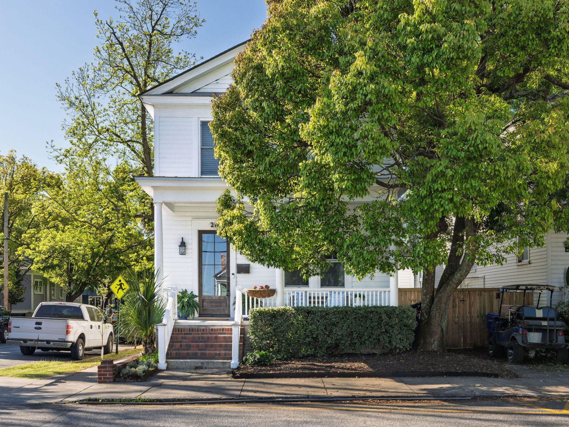 Welcome to 21 Cleveland Street -- a beautifully renovated historic Charleston home one block from Hampton Park. This unbeatable location places you mere feet from Sightsee Coffee and within easy walking distance of a vibrant selection of local restaurants and dining destinations. Built in 1920, this 3-bedroom, 2.5-bath residence offers 1,968 square feet of timeless character paired with thoughtful modern updates, all on a quiet corner lot beneath a majestic shade tree. Inside, classic Charleston charm shines through with high ceilings, original wood floors, exposed brick fireplaces, and a grand entryway staircase that makes a stunning first impression.The formal living room and elegant dining room with built-in bar create inviting spaces for entertaining, while the light-filled kitchen offers generous workspace and storage. Tucked away downstairs, you'll also find a hidden pantry, powder room, and laundry room for added convenience. Upstairs, the spacious primary suite is a true retreat featuring its own fireplace, walk-in closet, dual vanity, and oversized subway-tiled shower. Two additional bedrooms each offer their own unique charm and versatility for guests, family, or home office needs. Outdoor living is just as special, with a large covered front porch perfect for slow Lowcountry evenings, plus a fully fenced backyard with outdoor storage. A separate fenced side yard offers the rare potential for additional off-street parking. Start your mornings with a walk to coffee and the dog park, spend afternoons picnicking in Hampton Park, and end your evenings biking to some of Charleston's newest restaurants. Historic charm, modern comfort, and unbeatable walkability come together at 21 Cleveland Street.