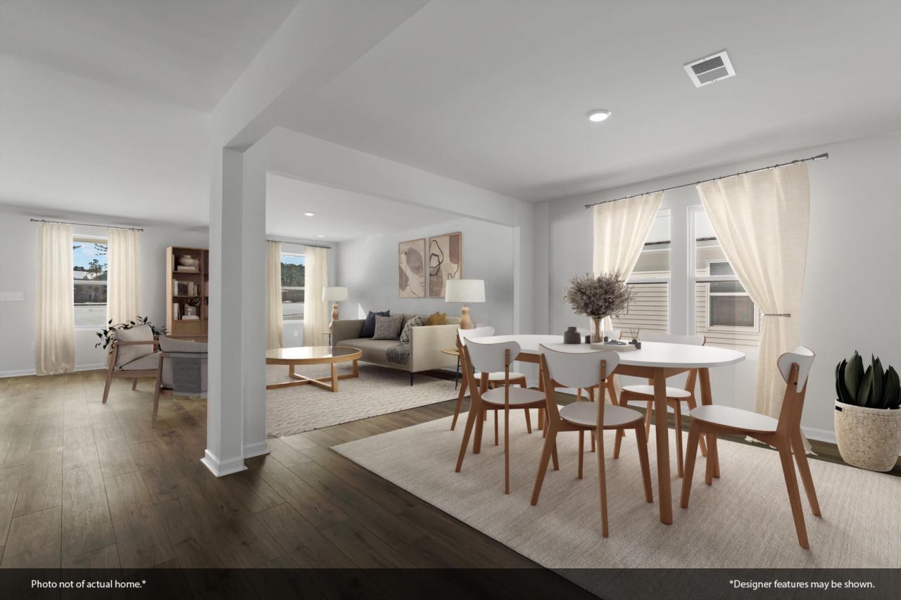 Ready now! Located in Central Creek, a brand-new boutique community in the heart of Goose Creek, this inviting two-story home offers 4 bedrooms each with a walk-in closet and 2.5 baths. The open main level is designed for comfortable everyday living, featuring a spacious family room, flexible flex space, and a modern kitchen with upgraded cabinetry and granite countertops. Luxury vinyl plank flooring and crown molding throughout the main floor add durability and style. The eat-in opens to a covered porch, perfect for relaxing or outdoor meals. Upstairs, the private primary suite includes two walk-in closets and a bath with dual sinks and a tiled walk-in shower. A centrally located laundry room serves all bedrooms. Situated on a rare corner lot for added room!