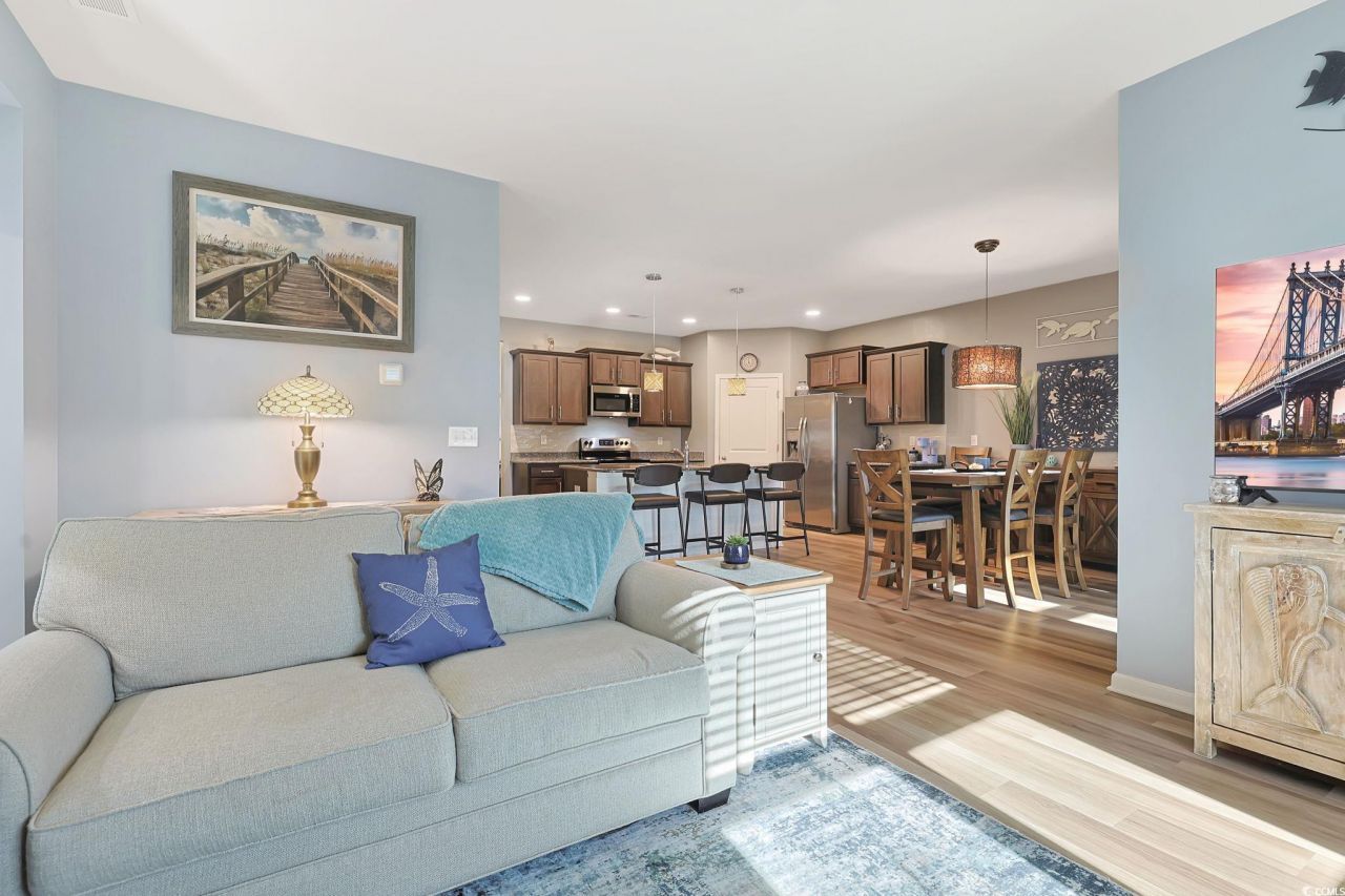 Introducing this vibrant 4 bedroom 2 bath home located in the popular Harmony at St James community. This captivating home features wood look LVP & carpet flooring, smooth flat ceilings, and a large comfortable living/dining room combo that showcases a sliding glass door that opens up to the delightful sunroom. The kitchen is equipped with a stainless steel appliance package, granite counter tops, cabinets topped with crown moulding, a practical kitchen island with a breakfast bar, recessed & pendent lighting, and an ideal kitchen pantry. The primary bedroom offers a ceiling fan, private access to the primary bath that hosts a vanity with dual sinks, a water closet, a deluxe step-in shower, and a large walk-in closet with extra shelving. This memorable home is completed with three additional bedrooms, full guest bath, a laundry room, a fenced in back yard with an uncovered patio that is perfect for grilling, and a two car attached garage. This home affords you easy access to the beach and golfing along with all of the other activities and happenings in Myrtle Beach including fun eateries, award winning off-Broadway shows, public fishing piers, and intriguing shopping adventures along the Grand Strand. Conveniently located to your everyday needs, including grocery stores, banks, post offices, medical centers, doctors offices, and pharmacies. Check out our state of the art 3-D Virtual Tour.