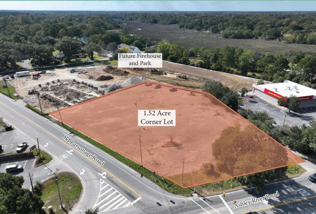 Excellent commercial land opportunity at the corner of Ashley River Road and Old Parsonage Road in desireable West Ashley; Fire Station and Public Park under construction behind the site