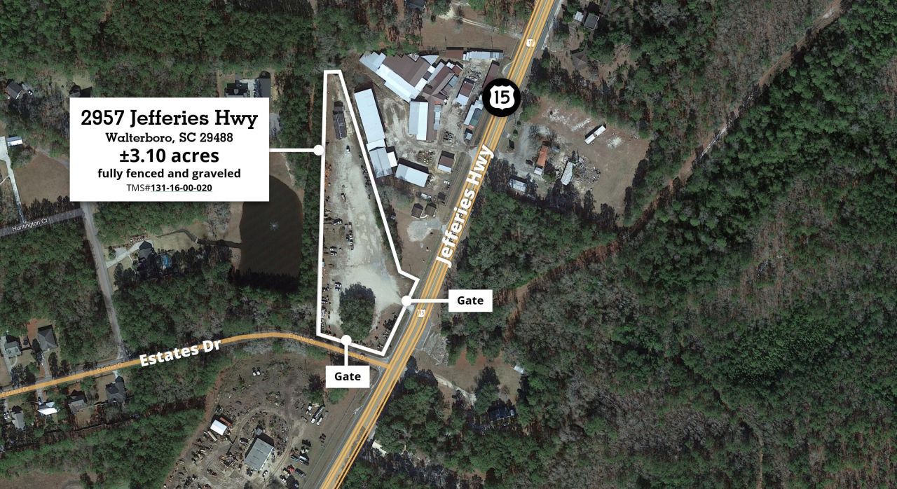 2957 Jefferies Highway aka US-HWY 15 in Walterboro, SC offers an opportunity to lease a 3.10-acre laydown yard located in Colleton County, South Carolina. Located 2.9 driving miles from I-95 (Exit 57, SC-64 / I-95), 3.6 driving miles to the Lowcountry Regional Airport, and 1 hour (+/-40miles) to Charleston.The site is fully fenced, graveled, and offers multiple ingress-egress points via Jefferies Hwy/US-15 (4 lanes) and another via Estates Dr. (2 lanes) for improved flow throughout the site. Potential to subdivide depending on a user's operation and requirement*The proximity to the interstate/I-95 corridor, multi-port access (54mi to Port of Savannah / 73mi to Port of Charleston), and over 240ft of frontage on one of Walterboro's major thoroughfares -this site offers visibility, proximity to major southeast port markets, and a secured option for a variety of Industrial Outdoor Storage (''IOS'') and related parking and commercial uses.Asking rate $2,000 to $3,000 per acre per month (NNN lease). Potential to subdivide as small as 1.25ac or ideally lease the entire site for a total of 3.10 acres, fully fenced and graveled. Asking rate for entire site $2,000/ac/month (3.10acres). Initial asking rate for subdivided options starting at $3,000/ac/month (1.25ac - 1.85ac approx.) Please note that available date and final yard layout and leased area (AC) for subdivided options are subject to terms and contingent upon Landlord review and approval.**Please note: the site is currently leased and being utilized as a contractor storage yard, please do not drop in on the Tenant - contact for details and to setup a time to tour the site. Thank you!**