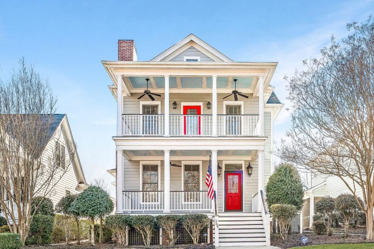 Charleston-style home in the desirable Harborside community of Lake Carolina. This two-story home features double front porches and freshly painted interiors. The main level offers a spacious living room with gas log fireplace, formal dining room, and a well-appointed kitchen with abundant cabinetry, excellent storage, and a breakfast bay window. The main-level primary suite includes an oversized bath with dual vanities, walk-in tile shower, garden tub, and two walk-in closets, plus a bay window with built-in storage. Laundry and mudroom off the kitchen provide a convenient drop zone. A screened-in porch is perfect for relaxing. Upstairs are three bedrooms, including one with a private bath, plus a Jack-and-Jill bath and loft landing.Detached two-car garage accessed from shared rear alley. New HVAC 2024. Termite bond. Enjoy sidewalks, pool, playgrounds, trails, and Lake Carolina amenities.