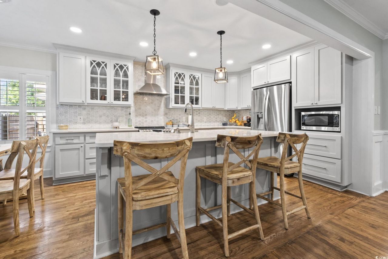 Here is the one youve been searching for! Oceanside of Hwy 17 Business in Myrtle Beach, totally renovated, mother-in-law suite, screened porch, oak trees, and a short flip flop walk to the beach. This nostalgic yet modernized 4-bedroom, 4-bath property (which includes a newly added 1-bedroom, 1-bath mother-in-law suite) perfectly blends timeless charm with todays comforts. Originally built in 1946 and fully renovated in 2019, the home offers peace of mind with extensive updates including all-new plumbing, electrical, sewer/electrical mains to the street, premium-grade shingles with structural roof reinforcements, Low-E impact-rated windows, updated insulation in both attic and crawlspace, and a high-efficiency 18 SEER HVAC system with variable speed air handler. Interior finishes showcase quartz and marble details, refinished original hardwood floors, plantation shutters, crown molding, wainscoting, and custom architectural woodworking that honor the homes history while delivering modern luxury. Additional upgrades include a natural gas tankless water heater, whole-home water filtration with booster pump, circular driveway, 8-zone irrigation, and custom fencing with gated golf cart access. In 2021, a rear building was added featuring spray foam insulation, impact-rated windows and doors, Cat 6 internet, generator transfer switch, mini-split HVAC, and its own tankless water heaterdesigned to serve as a hurricane-ready lifeboat or versatile bonus space. Outside, the fenced yard includes Astroturf play areas, pet/child-friendly zones, and a movable golf cart deck. Perfectly located just minutes from the beach, shopping, restaurants, and entertainment, this property offers not only a beautiful home but also a lifestyle in the heart of Myrtle Beach. Dont miss your chance to make this rare find your own!