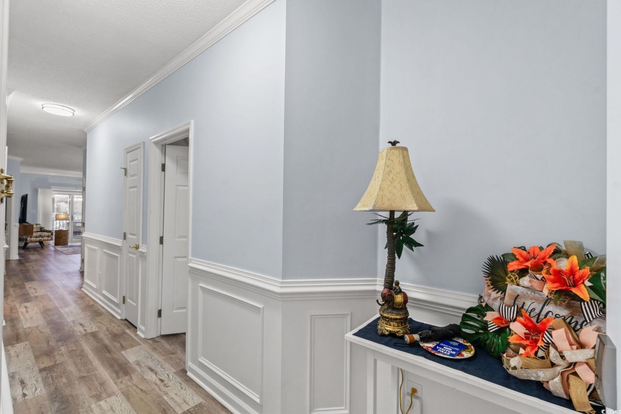 Experience refined coastal living in this 3-bedroom, 2-bath ground-floor residence offering unobstructed harbor and boardwalk views within the highly sought-after HarbourFront Villasa serene enclave defined by the quiet beauty of waterfront living. Extensively renovated, this elegant condo showcases luxury vinyl plank flooring throughout, a fully updated kitchen with new cabinetry, designer hardware, and stainless steel appliances, along with thoughtful upgrades at every turn. The welcoming entry foyer is bathed in natural light and enhanced with chair rail and shadow-box detailing, flowing seamlessly into the living and dining areas. The former laundry room has been cleverly reimagined as a spacious double pantry, complete with stacked washer and dryer for added convenience. Custom window treatments throughout, including silhouette blinds on the sliding doors, allow you to enjoy stunning harbor and boardwalk views while maintaining privacy when desired. Additional craftsmanship elevates the home further, with crown molding throughout and a striking shaker-style wood accent wall in the primary bedroom, adding warmth and architectural interest. Perfectly positioned on Coquina Harbor, this residence is just a short drive to the beach, Little Rivers vibrant waterfront, and local dining and entertainment. Steps from your door, enjoy a beautiful free-form community pool and expansive hot tub. For boating enthusiasts, rental slips and private boat slips available for purchase provide effortless access to the water. Offered fully furnished and move-in ready, this exceptional home embodies true luxury condo living. High ceilings, impeccable finishes, and meticulous attention to detail make this a must-see waterfront retreat.