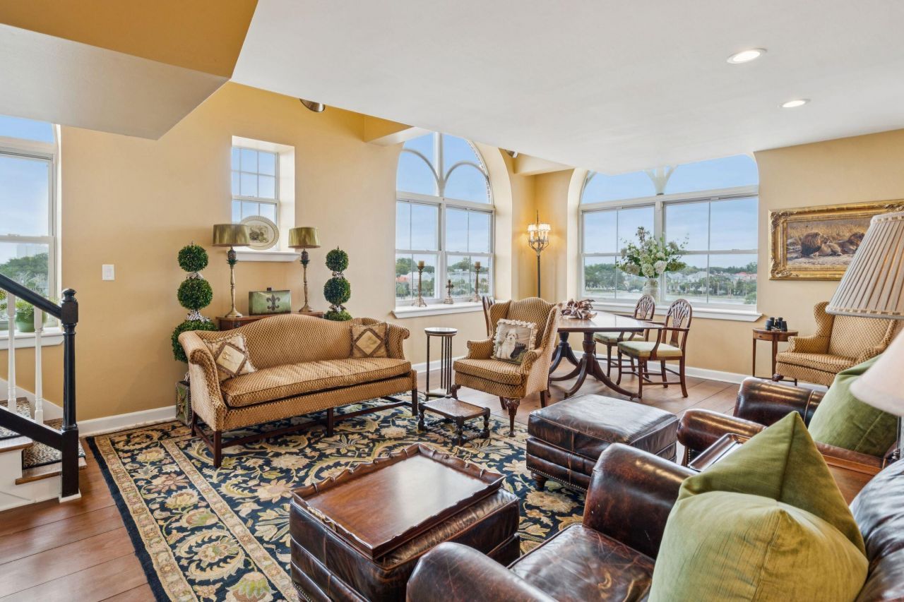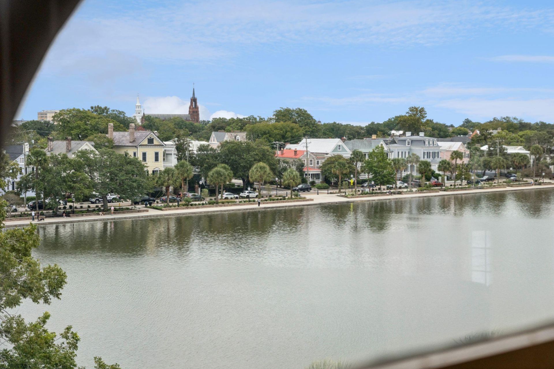 Experience breathtaking views stretching from the Ravenel Bridge to The Jasper on Broad Street from this unique, top floor, corner condominium at the historic Baker House overlooking Colonial Lake. Enjoy passive, park life and interesting wildlife, spectacular sunrises silhouetting the Charleston skyline in the mornings and colorful sunsets reflecting in the many windows of The Jasper and on the lake in the evenings. Built as a private hospital in the early 1900s, Baker House was converted into condominiums in the early eighties and Number 18 was renovated in 2021 and named ''Seven Spires''. The first level boasts three huge, Palladian style windows that showcase the panoramic vista from the living and dining area, beautiful wide plank flooring, a galley kitchen and half bath.This level also includes a large beverage bar with a wine cooler, coat closet and additional space separating the living area and kitchen for use as a media room, office or smaller dinette. Three bedrooms and two full bathrooms comprise the second level with unusually ample closets throughout. No storage issues here! The spacious, primary bedroom features a tiled, en-suite bathroom with a large shower and quartz countertop. The other two bedrooms are generously sized as well with skylights that enable one to sleep under the moon and the stars! A second, large, tiled bathroom with a combination tub and shower and quartz countertop is located off the hallway just a few steps from both bedrooms. Moultrie Park, a large, active park offering sports such as tennis, pickleball, and basketball, abuts the large, private parking lot for Baker House residents. Restaurants within close walking distance include The Alcove Market, Costa and Circa 1886. The Crosstown (Highway 17), connecting to all points north, east and west, is a three minute drive. This offering is an exceptional opportunity to live in an historic building, Baker House, in an historic neighborhood, Harleston Village, on the quiet, residential side of the peninsula and to enjoy fabulous views of Charleston above the tree tops! Chandeliers do not convey.