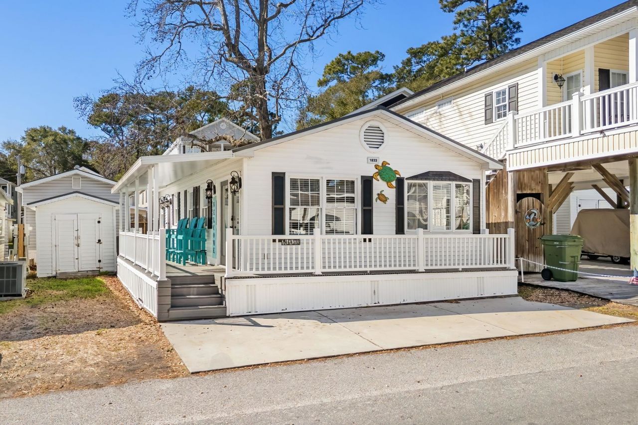 Welcome to 1833, a beautiful seaside/beach decor home with 2-bedrooms & 2 baths in Ocean Lakes Campground with full-size washer/dryer located inside the home in its own Landry room. Enjoy the East facing covered porch for sun in the morning for your coffee and shaded in the afternoons for happy hour! August 2025 New HVAC, 3-year composite decking and handrails, covered porch with four poly-wood chairs. 2024 improvements include new floors, primary bath vanity, refinished both bathtubs, painted interior, and new water heater in 2024. Metal Roof was replaced in 2020. Home is being sold FURNIHSED. Annual lot lease is paid half in January and the other half is paid in July. The annual lease covers your basic cable TV, garbage pick-up, 24-hour security and access to all the amazing amenities that Ocean Lakes has to offer.