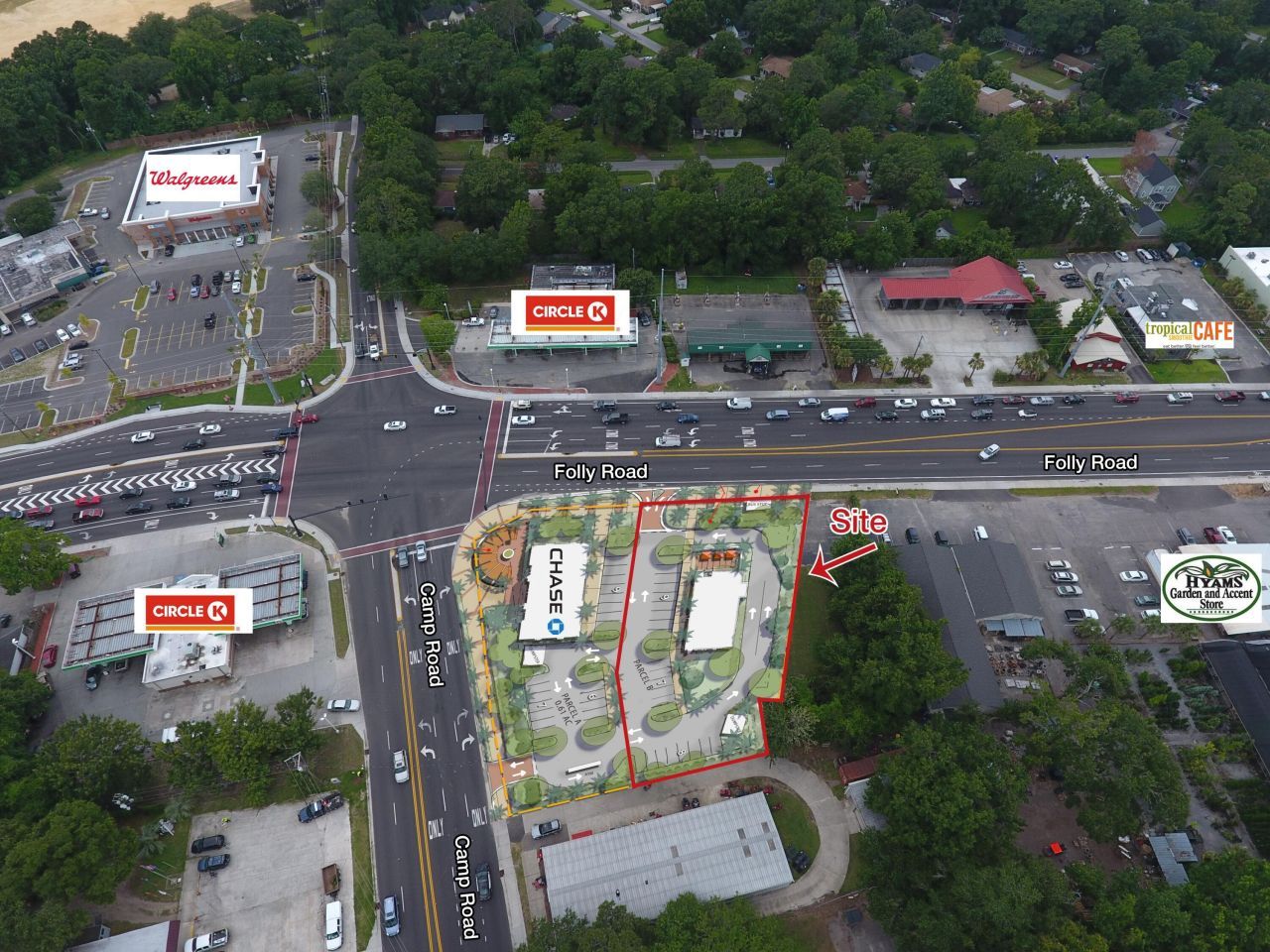 Ground lease opportunity located on one of Charleston's busiest thoroughfares (46,400 VPD - SCDOT).The +/-0.65 acre property is adjacent to the newly developed Chase Bank with shared ingress/egress access off of Camp Road and a Right In/Right Out on Folly Road.