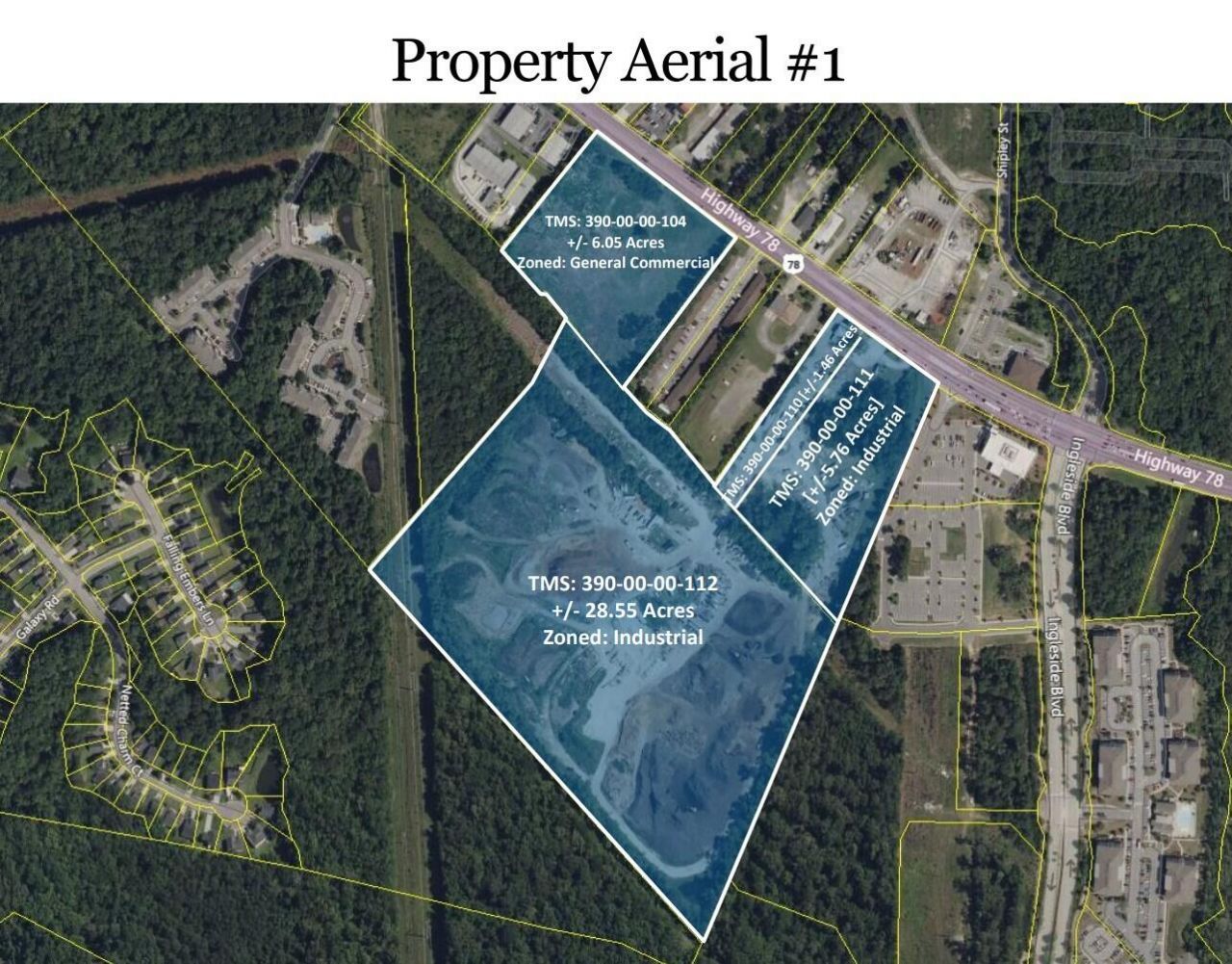 Charleston County TMS#s 390-00-00-111 (+/- 5.76 Acres), 390-00-00-110 (+/- 1.46 Acres), 390-00-00-112 (+/- 28.55 Acres), and 390-00-00-104 (+/- 6.05 Acres) are being offered as a unique collection totaling +/- 41.82 acres.With a mix of Industrial and General Commercial zoning in Charleston County, these properties provide exceptional flexibility for a wide range of potential uses.Featuring substantial frontage along US Highway 78 and convenient proximity to Interstate 26, this site offers excellent visibility, accessibility, and connectivity.A rare opportunity for investors, developers, or end-users seeking a strategic location in the Charleston region's growing corridor.