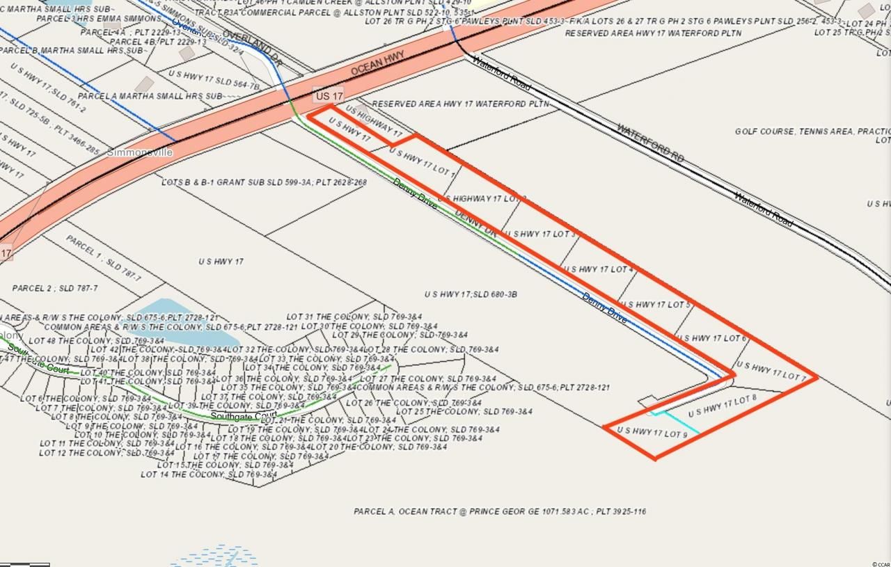 Sale is for 10 approximately 1-acre parcels. All zoned R-1, but the corner lot on 17 could be rezoned commercial. Water and Sewer served from Hwy 17. There is a water line and a sewer force main at the intersection. Pump station would need to be installed at lowest point of the road on Denny Drive. Sale includes the following TMS: 04-0418-012-00-00, 04-0418-012-01-00, 04-0418-012-02-00, 04-0418-012-03-00, 04-0418-012-04-00, 04-0418-012-05-00, 04-0418-012-06-00, 04-0418-012-07-00, 04-0418-012-08-00, 04-0418-012-09-00.Acreage is an estimate based on county assessor info & Buyer is responsible for verifying exact acreage.