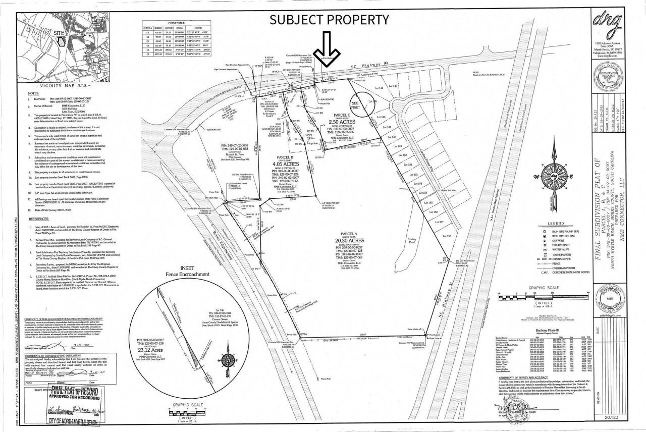 This 2.5-acre Highway Commercial (HC) site presents a compelling commercial development and investment opportunity within one of North Myrtle Beachs fastest-growing growth corridors. The property benefits from immediate adjacency to a new 360-unit multifamily community currently under construction, providing a built-in customer base and supporting long-term commercial demand. The site is also strategically positioned near the North Myrtle Beach Park & Sports Complexan established regional destination that drives consistent traffic and supports a broad range of retail, hospitality, and service-oriented uses. Highway Commercial (HC) zoning provides maximum flexibility for a variety of development concepts, including restaurant, retail, lodging, and professional office uses. As part of a comprehensive master development, the property includes meaningful infrastructure advantages and cost-saving components already in place, including a shared retention pond and lift station that have been constructedreducing entitlement and development timeline risk. Conveniently located near the intersection of Robert Edge Parkway and Highway 90 with direct access to Highway 31, the property is positioned to capture continued residential expansion and sustained tourism demand, while remaining only minutes from the beach. This is a rare opportunity to secure a premier commercial pad in a high-growth submarket with strong fundamentals and accelerating development activity. **Agent Owned**