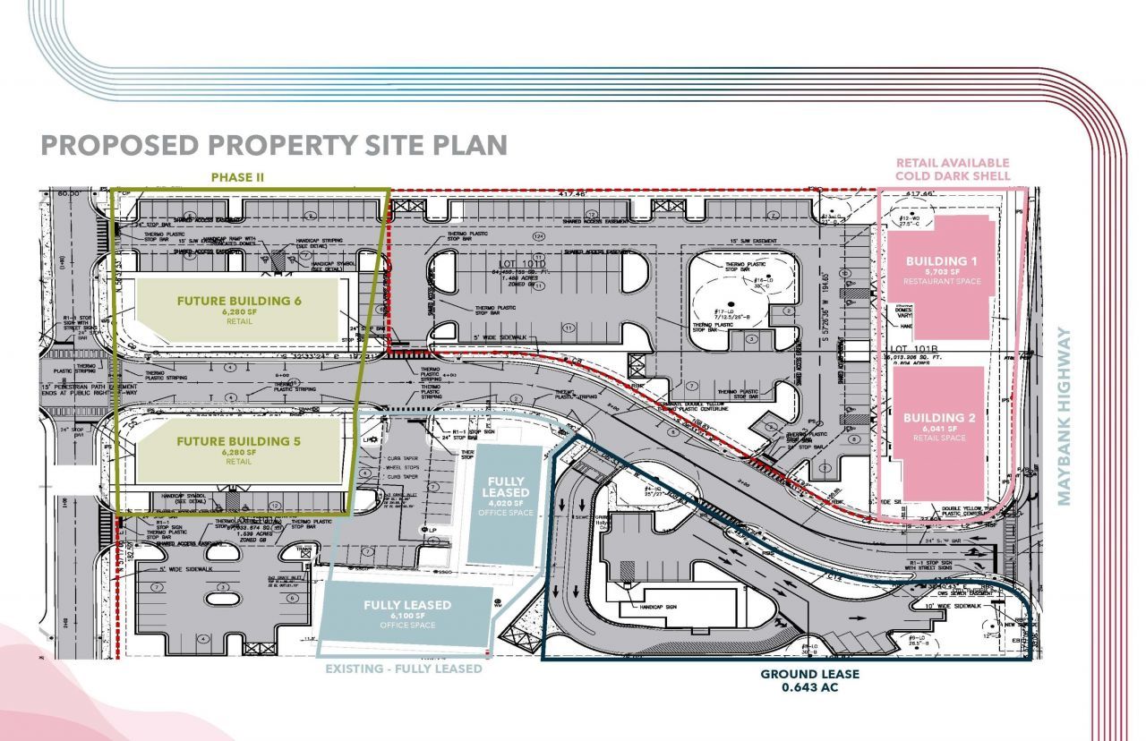 Centrally located on Maybank Highway equidistant from Main Road and River Road,Maybank Landing will be a Class A mixed-use retail development. The project willfeature approximately 13,394 SF of retail fronting Maybank Hwy split between threebuildings and 43,620 SF of flex product. Boosted by the recent announcement ofthe planned $277M Trident Medical Center and upcoming Urgent Care just feetaway, Maybank Landing will also benefit from the rapid population growth and theestablishment of this strip of Maybank Highway as a prime retail corridor. With ample parking, easy access, and the possibility for a drive-thru, Maybank Landing has all of the necessary elements for a Class A project that will benefit the Johns Islandcommunity for years to come.Building 1: 5,703 SF | Building 2: 6,041 SF | Building 8: 13,600 SF |Building 9: 13,600 SF | Building 10: 8,580 SFGround Lease Parcel: 0.643 AC