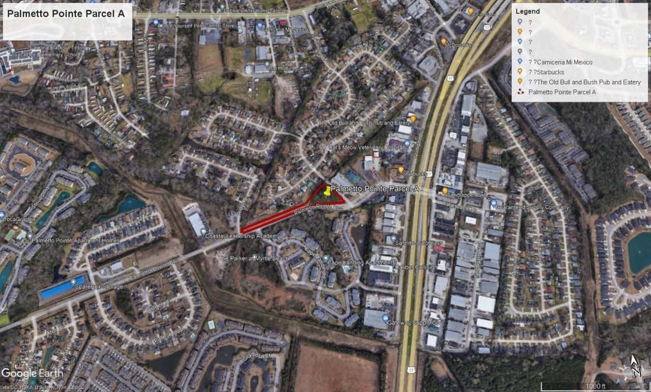 Palmetto Point Blvd. road was extended to Highway 544 and the big block area. Traffic Count is 9,500 along Palmetto Point Blvd (2023). Just down from Market Common. About a 100 yards from Highway Bypass 17 and a couple miles from SayeBrooke Shopping Center (Target, Pet Smart, Marshalls, etc). It is zoned as Office, Professional and Institution. Great corner acreage in b/n two roads which heads to several developments (Stone Bridge). Great visibility to all traffic along Palmetto Pointe Blvd. Starbucks just around the corner along with Caliber Collision, Safelite Autoglass, The Old Bull and Bush pub eatery, etc.