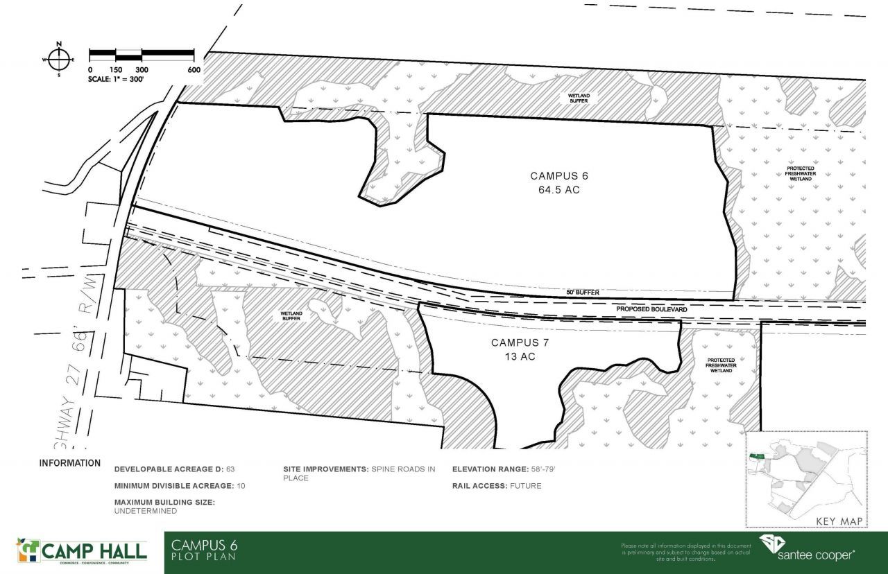 Campus 6 is a 64.5 acres site at Highway 27 and Redwood Material Drive. Advantageous power situation as the site is served by Santee Cooper. Land disturbance permits in hand for site construction. All roads and utilities in place.
